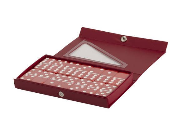 Item Description: Double 6 standard red color dominoes in vinyl case