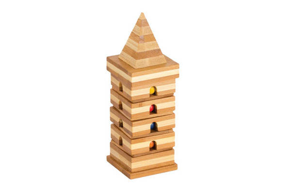 Item Description: Bamboo square puzzle tower with 4 sets of color beads
